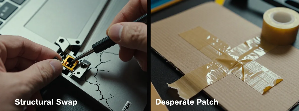 I see this specific failure mode constantly. It’s not a fluke; it’s a design flaw in plastic chassis construction. Users are stuck between a rock and a hard place: the laptop is barely usable, but the repair costs or complexity feel overwhelming. The discussion is always the same—how do you stop the crack from spreading without spending a fortune or risking a total loss? Here’s the thing nobody talks about: the damage isn’t just cosmetic. It’s a structural failure that compromises the entire integrity of the machine.